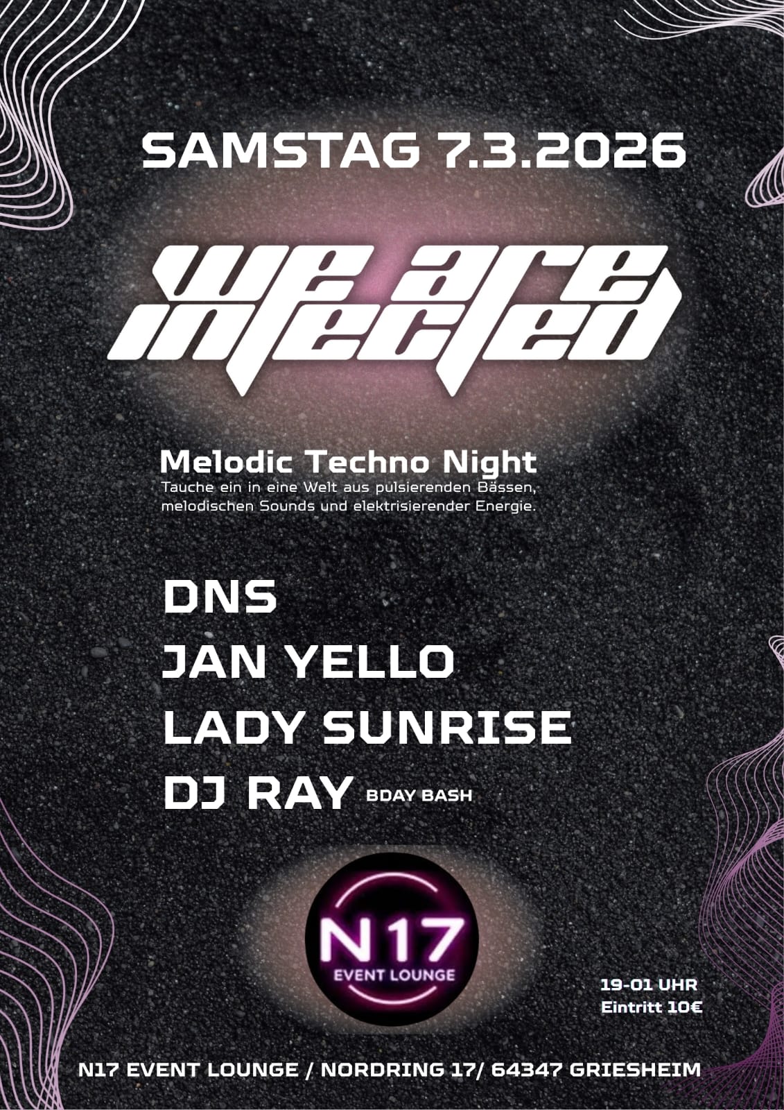 Es ist wieder soweit... In der N17 EVENT LOUNGE in Griesheim startet "We are infected" - Melodic Techno Night.
