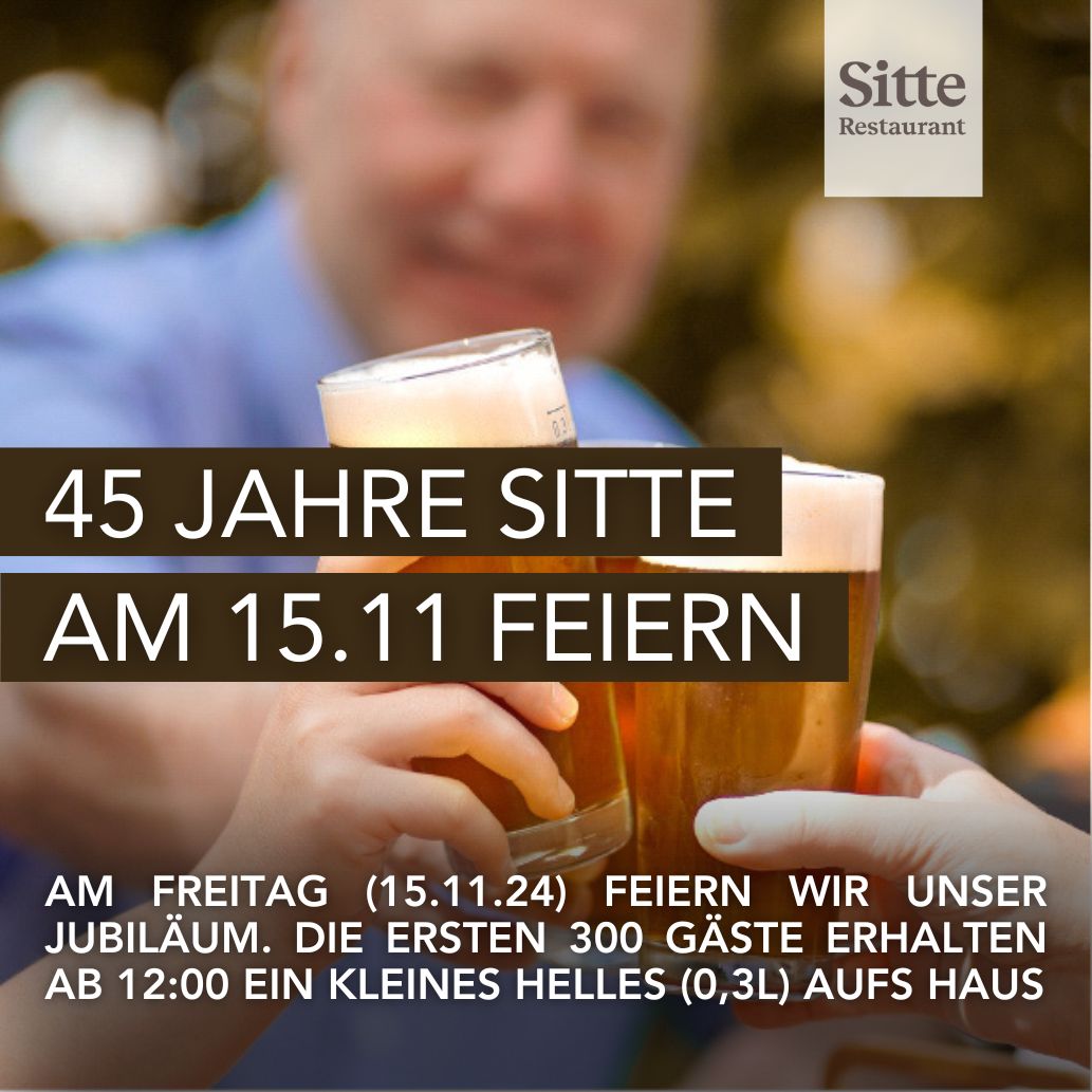 Das Restaurant Sitte lädt ein, gemeinsam 45 Jahre Tradition und Gastfreundschaft zu feiern. Seit 1978 steht das Sitte für Genuss, Gemütlichkeit und gesellige Stunden – ein Ort, der Menschen zusammenbringt und unvergessliche Momente schafft.