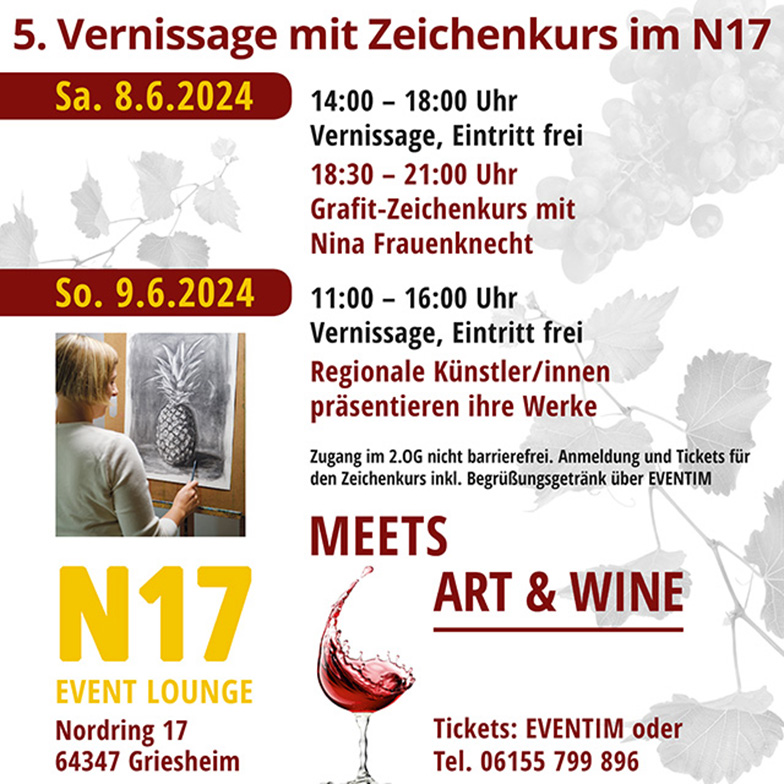 5. Vernissage in der N 17 EVENT LOUNGE mit regionalen Künstlern. Ab 18:00 Beginn Grafit-Zeichenkurs mit Nina Frauenknecht. Anmeldung unter: 06155 799 896. Preis Zeichenkurs 35,- Euro inkl. Sektempfang. Nicht barrierefrei im 2.OG. Parkplätze vor Ort vorhanden.
