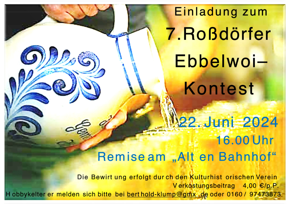 Die Bewirtung inkl. hessischen Leckereien passend zum Ebbelwoi, übernimmt das Team vom Kulturhistorischen Verein Roßdorf.