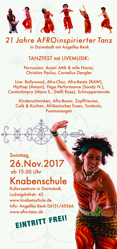 Live: Anani Attih & friends (Togo, percussion), Christian Paulus (Darmstadt, Hang), Cornelius Dengler (Gross-Umstadt, Basstrommeln). Afro-Tanzgruppen, Afro-Schnupperworkshops, Contact Improvisation, HipHop, AfroBEATZ, Bollywood, Afro-Chor, Yoga-Performance, Projektvorstellung (Ingenieure ohne Grenzen), Kinderecke, Kinderschminken, Café u. Kuchen, westafrikanische Speisen, AfroBasar, "nicht-materielle Tombola" und vieles mehr.