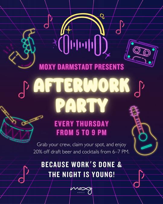 "Du weißt nicht, wohin du deinen Donnerstagabend nach der Arbeit verbringen sollst? Bei der After Work Party von Moxy von 17 bis 22. "Happyhour" – 20% auf Fassbier und Cocktails von 18-19 Uhr!