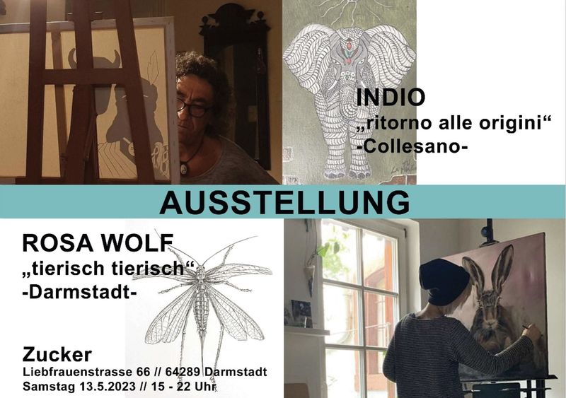 INDIO aus Collesano/Sizilien und Rosa Wolf aus Darmstadt zeigen unter dem Motto "Ritorno alle Origini" und "tierisch tierisch" aktuelle Arbeiten aus ihren Ateliers. Zu sehen gibt es buntes und schwarz weiß auf Leder, Leinwand, Folie und Papier.