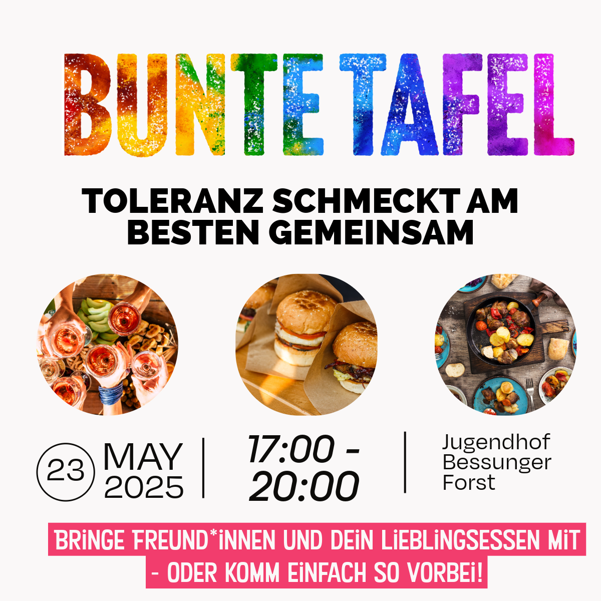 "Du bist zwischen 13 und 27 Jahre alt und hast Lust auf gute Gespräche, neue Leute und leckeres Essen in entspannter Atmosphäre? Du wohnst aus dem Großraum Darmstadt oder dem Landkreis Darmstadt-Dieburg? Dann komm zur Bunten Tafel unterm Baum! Gemeinsam setzen wir ein Signal für Solidarität, Vielfalt und respektvollem Miteinander – mit allem, was dazugehört: Vielfalt auf dem Teller und im Gespräch.
