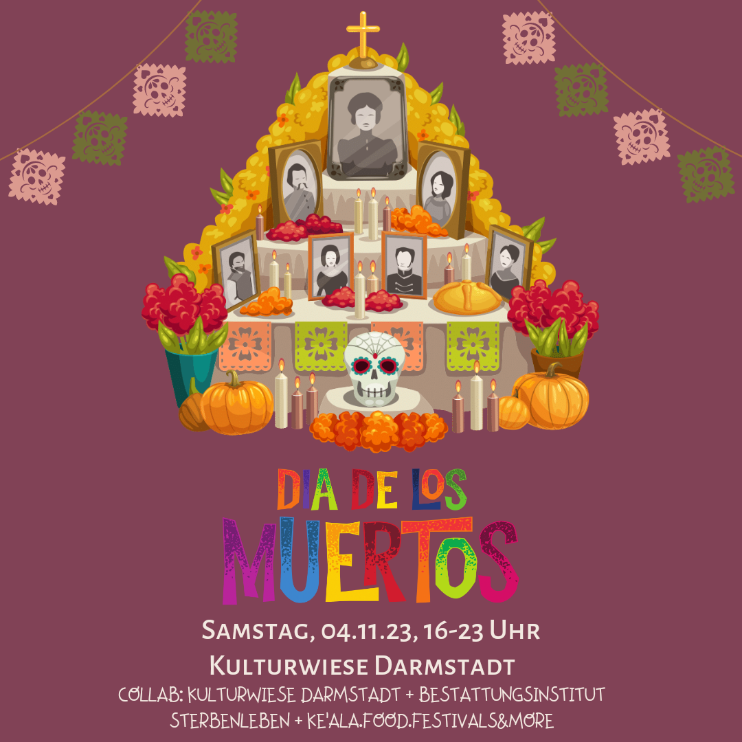 Heute findet der Tag der Toten in Kooperation mit der Kulturwiese Darmstadt und dem Bestattungsinstitut "Sterbenleben" auf der Kulturwiese der Wagenbausiedlung statt. Natürlich ist das Thema der Tod, aber der Sinn und Zweck des Ganzen ist es, seine Liebe und seinen Respekt in feierlicher Atmosphäre für verstorbene Familienmitglieder und Freunde zu zeigen. Bringt Blumen und Fotos eurer verstorbenen Lieblinge für den Altar, gerne auch z.B. die Lieblingszigarre, Essen für den Opa oder den Lieblingskuchen, Getränk etc. für die Mama und feiert gemeinsam mit uns das Leben. Das Event ist für groß und klein, inklusive Schminkstation. Der Foodtruck von "Keala Events" wird vor Ort sein und Euch mit leckeren Speisen und Drinks versorgen.