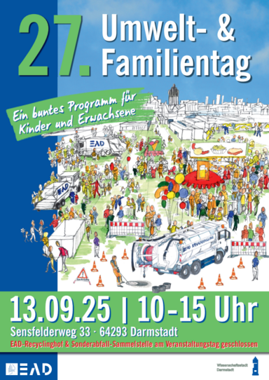 Auf die Kinder wartet ein umfangreiches Spielangebot: das Rotzfreche Spielmobil, Bungee-Trampolin, Hüpfburg, Riesenrutsche und ein Schminkstand sind mit dabei. Ausreichend Bewegung gibt es beim Fahrradparcours oder beim Torwandschießen in Kooperation mit dem SV Darmstadt 98. In der Fahrzeughalle stellt der EAD elektrische Mobilität sowie die Entwicklung eines umweltschonenden Fuhrparks für Darmstadt vor. Zudem werden nachhaltige Lösungen wie die mobilen Komposttoiletten, Geschirrmobile und Pflanzenkohle als Blumendünger gezeigt.