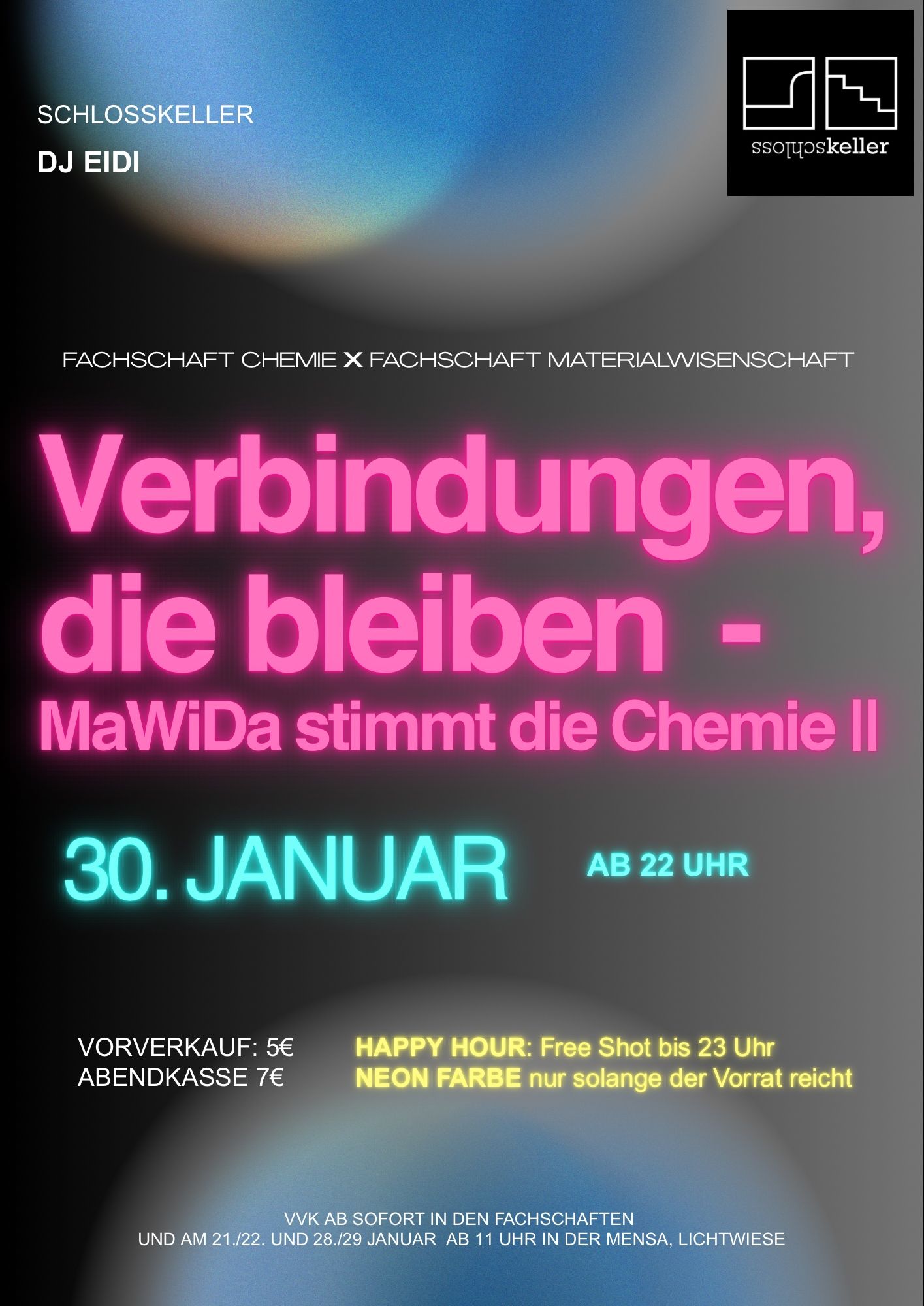es ist wieder soweit – die Fachschaften Mawi und Chemie laden euch zur zweiten großen NEON-Party im Schlosskeller ein: „MaWiDa stimmt die Chemie! Verbindungen die bleiben.“