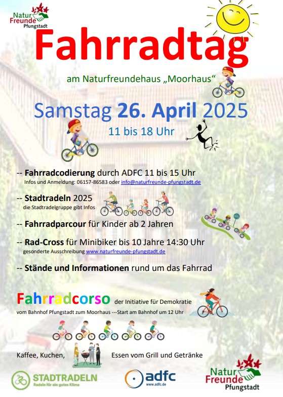 Die Naturfreunde OG Pfungstadt richten wieder einen Fahrradtag am Naturfreundehaus „Moorhaus“ aus. Von 11 Uhr bis 15 Uhr wird der ADFC die Codierung der Fahrräder vornehmen. Diese kostet 10€ pro Fahrrad. ADFC-Mitglieder erhalten 50% Rabatt, und wer in den ADFC eintritt, gibt es die Codierung als „Willkommensgeschenk". Mitgebracht müssen neben dem Fahrrad ein gültiger Personalausweis sowie die Kaufrechnung bzw. Kaufquittung des Fahrrads. Um einen zügigen Ablauf zu garantieren, ist eine Anmeldung sinnvoll. Geplant ist auch ein Fahrrad-Corso ab 12 Uhr vom Bahnhof Pfungstadt über die Eberstädter Straße zum Moorhaus, um auf diesen Aktionstag aufmerksam zu machen. Dort, am Moorhaus, gibt es Informationen rund ums Radfahren, z.B. von der Stadtradeln-Gruppe zum Stadtradeln 2025 sowie zum Thema Radsicherheit und Mobilität. Auf dem Wiesengelände wird ein kleiner Cross-Parcours für Minibiker von 4 - 10 Jahren für einen kleinen Wettbewerb aufgebaut. Für das leibliche Wohl ist ebenfalls gesorgt: Kaffee, Kuchen, heiße Würstchen und kühle Getränke. Anmeldung Codierung und weitere Infos: info@naturfreunde-pfungstadt.de, oder Tel. 06157- 86583.