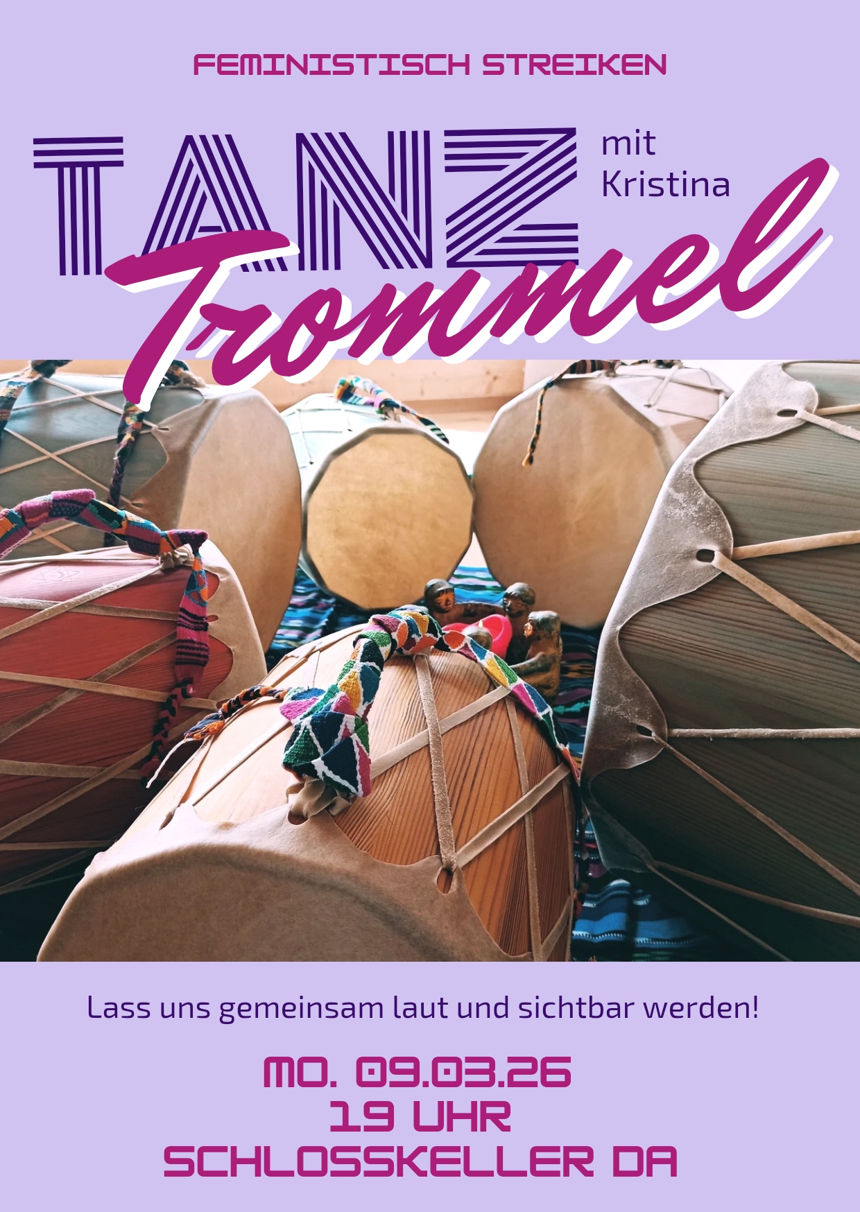 Kristina läd Euch ein, all Eure Energie noch einmal mit anderen Menschen zusammenzubringen und gemeinsam laut trommelnd das Patriarchat zu verabschieden.