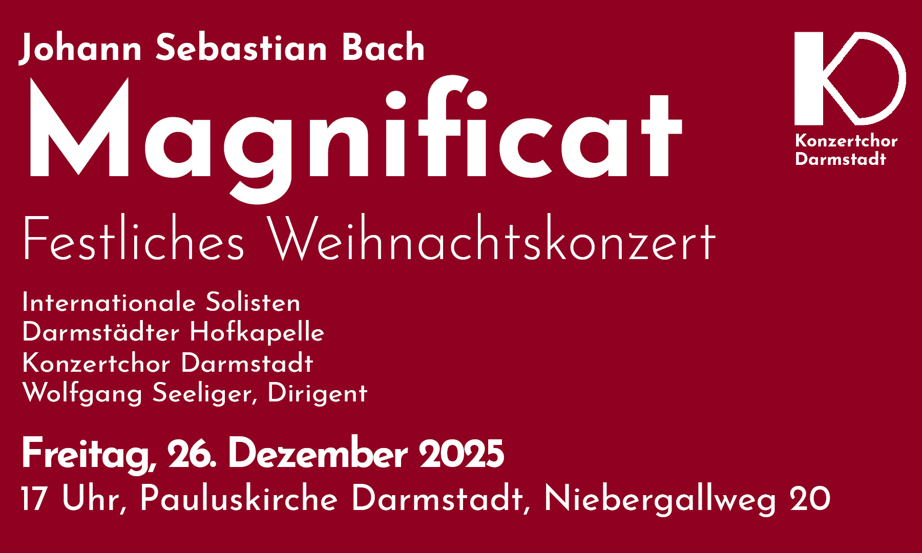 Der Konzertchor Darmstadt lädt zu seinem alljährlichen „Festlichen Weihnachtskonzert“ ein: Mit Johann Sebastian Bach „Magnificat“ wird das Programm zur Weihnachtszeit eingeleitet. Außerdem wird das Programm mit bekannten Werken aus der Barockzeit erweitert.