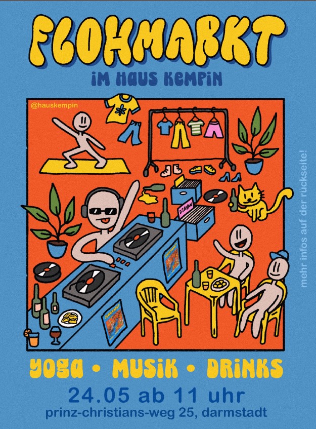 Flohmarkt mit Musik (Vinyl-Set), günstige Drinks und Snacks.