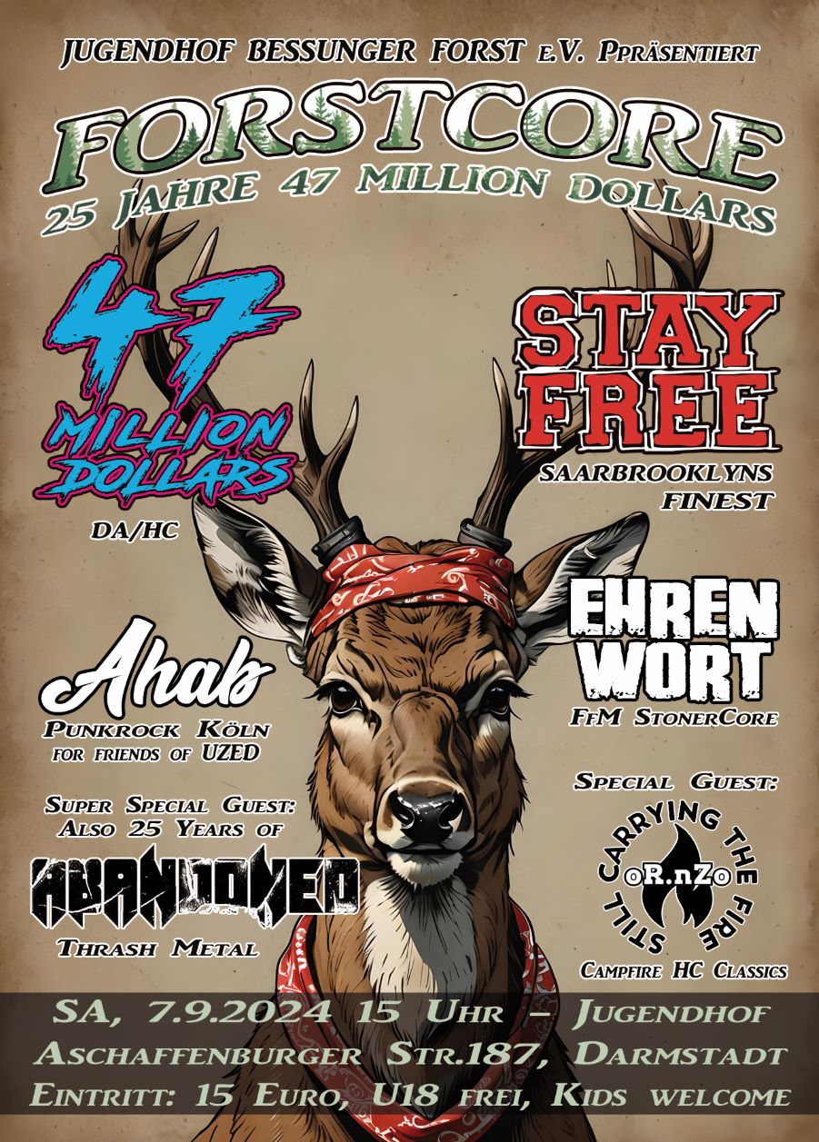 STAY FREE - Hardcore aus Saarbrücken. Hier sind Musiker dabei, die wir z.T. schon viele Jahre kennen und wo es immer wieder zu gegenseitigen Austausch-Konzerten und anderem Wahnsinn kam. Eigentlich sind Stay Free und 47 die offiziellen Vertreter der hessisch-saarländischen Freundschaft! Musikalisch hart, menschlich zart geht es bei Stay Free zu. Positive Mental Attidtude!