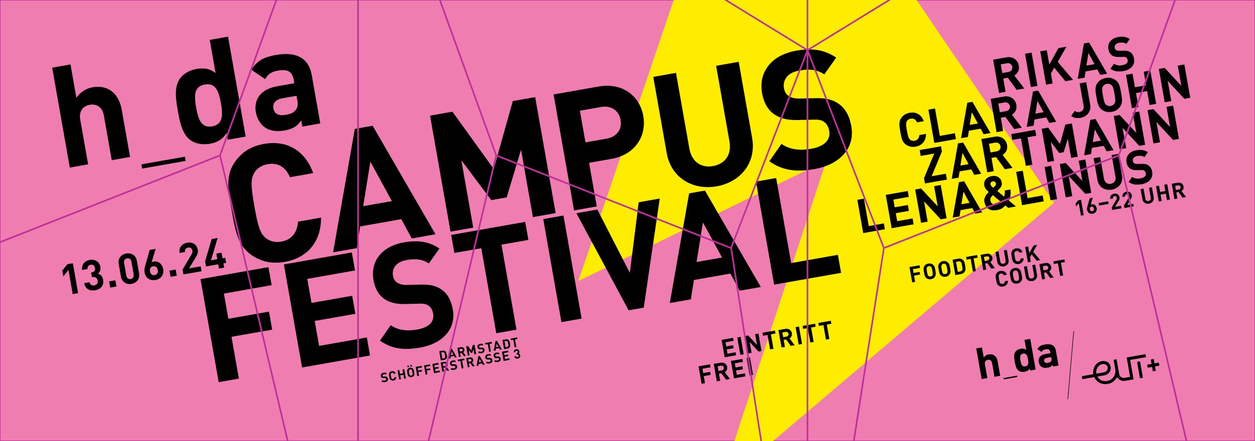 "Vier Live Acts erwarten euch beim Open-Air h_da Campusfestival am 13. Juni: Die deutsche Pop Band Rikas mit Einflüssen aus Funk und Soul, die deutsche Indie-Pop Band Lena&Linus, die Singer-Songwriterin Clara John, deren Musik Retro-Synths und Ambient-Klänge prägen und der Berliner Musiker Zartmann, der es versteht musikalische Gegensätze zu verbinden. Tanzen könnt ihr außerdem auf dem Open-Air Dancefloor von Basskultur Darmstadt und ein vielseitiges Angebot des h_da Hochschulsports steht auch noch zur Verfügung. Nach Ende des Bühnenprogramms startet ab 22 Uhr die AStA-Party im Glaskasten.