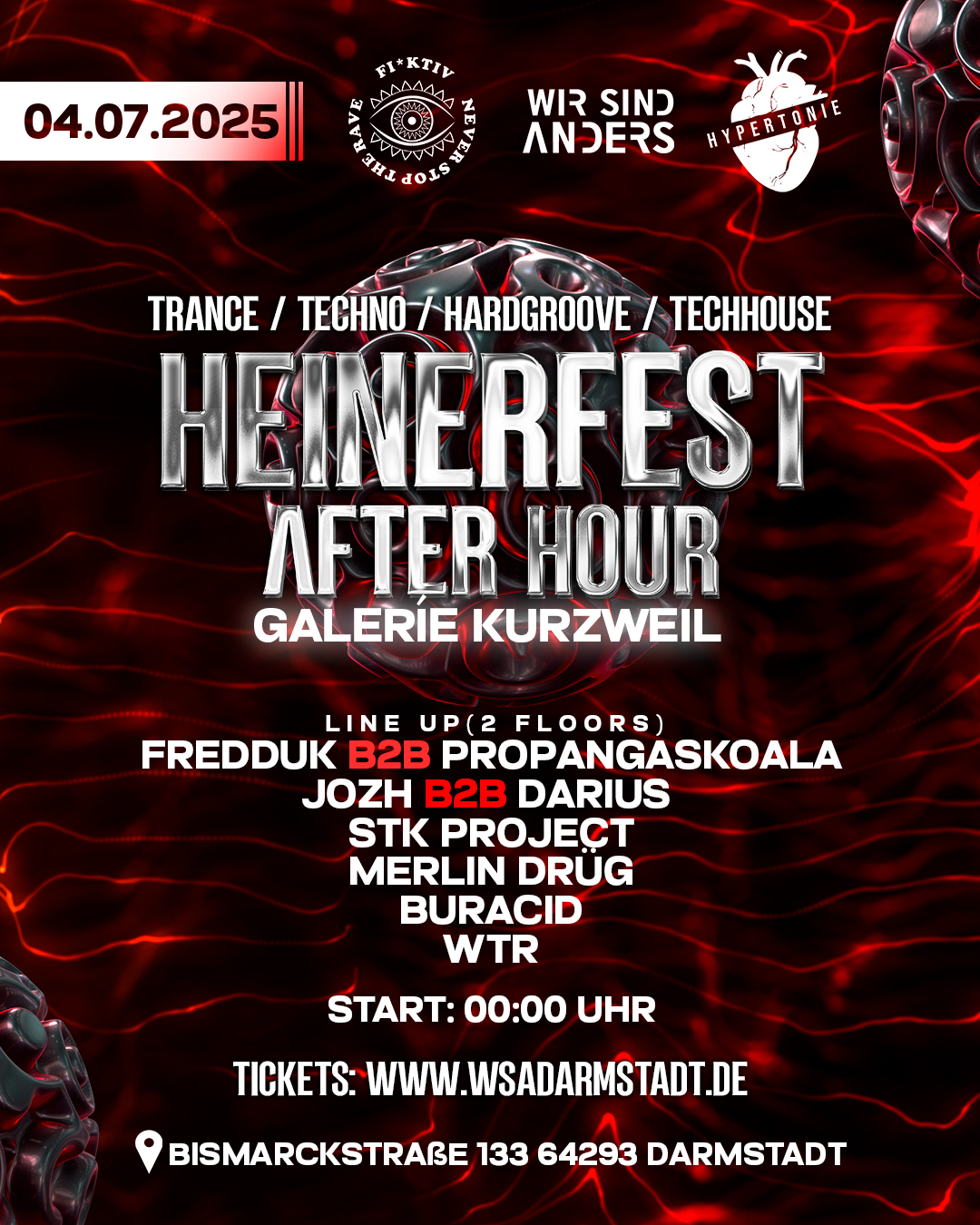 "Im Juli wird Darmstadt erneut zum Treffpunkt für alle, die elektronische Musik leben. Wir sind zurück auf dem Heinerfest, mitten in der Stadt, direkt auf dem Gelände des Jugendstilbad. Gemeinsam mit dem Ponyhof zelebrieren wir einen Tag voller Energie, Bass und Glücksmomenten. Und dieses Jahr legen wir noch einen drauf: Erstmals geht es danach weiter zur offiziellen After Hour in die Galerie Kurzweil.