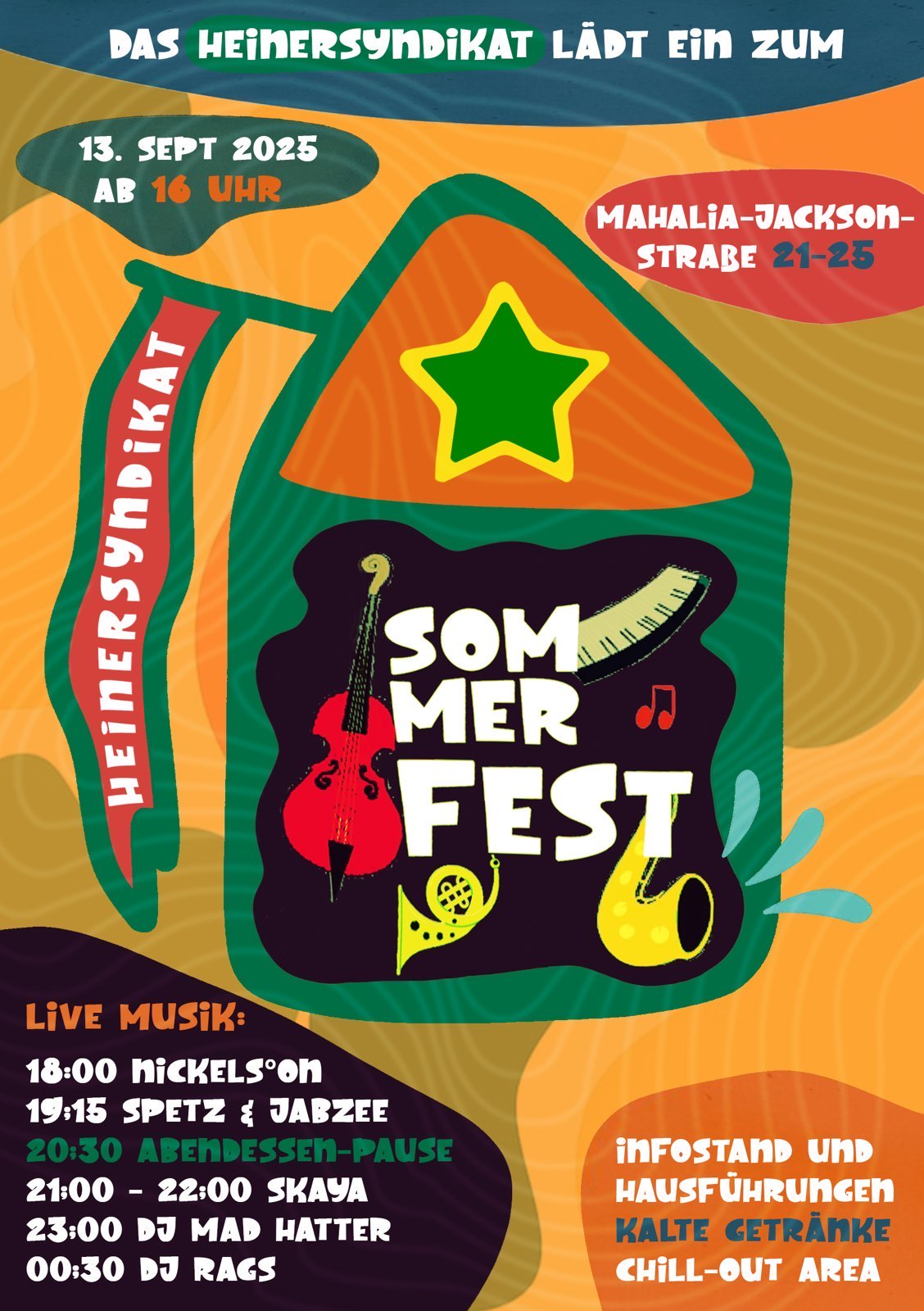 "Vielleicht habt Ihr schonmal vom Heinersyndikat gehört? Wir organisieren unser gemeinschaftliches Wohnprojekt selbst; genauso wie unser legendäres alljährliches Sommerfest! Ein Fest für alle die Lust auf eine letzte Sommerparty haben. Mit verschiedenen Bands, Essen, Infos über unser Wohnkonzept und vielem mehr."