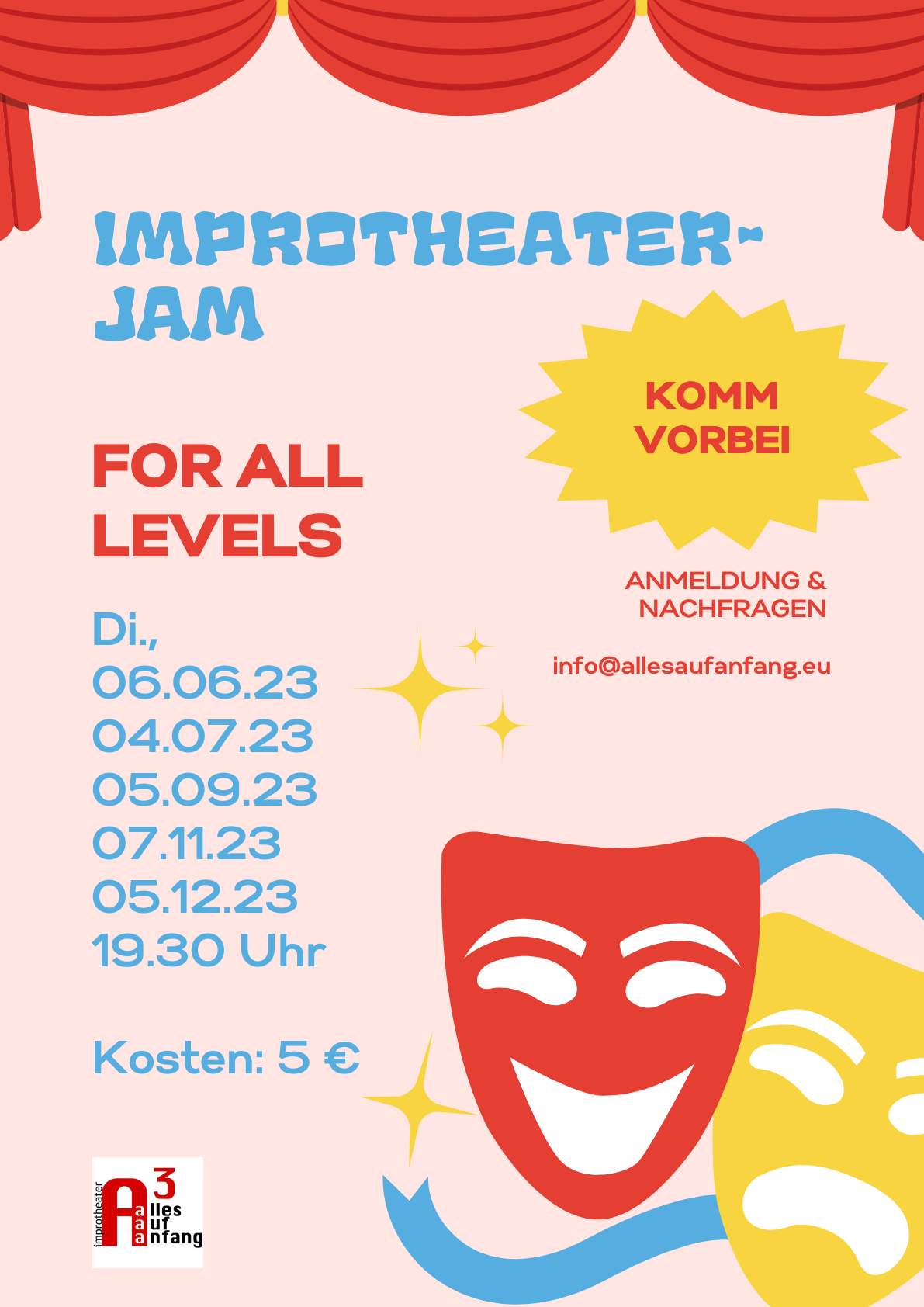 Du bist neugierig und wolltest schon immer mal Improtheater ausprobieren? Du hast Erfahrung, aber niemandem mit dem du regelmäßig spielen kannst? Dann komm zu unserem Jam! Wir leiten zu Beginn an und öffnen dann für alle. Ihr dürft auch gerne Ideen mitbringen. Ein Spiel das ihr mal als Zuschauer*in gesehen habt und ausprobieren wollt? Her damit. Kein Problem! Traut euch, raus aus der Komfortzone!