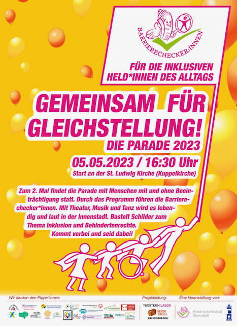 Zum zweiten Mal findet am 5. Mai, dem Protesttag zur Gleichstellung von Menschen mit Behinderung, in Darmstadt eine Parade unter dem Titel: Gemeinsam fu?r Gleichstellung – für die inklusiven Held*innen des Alltags statt.