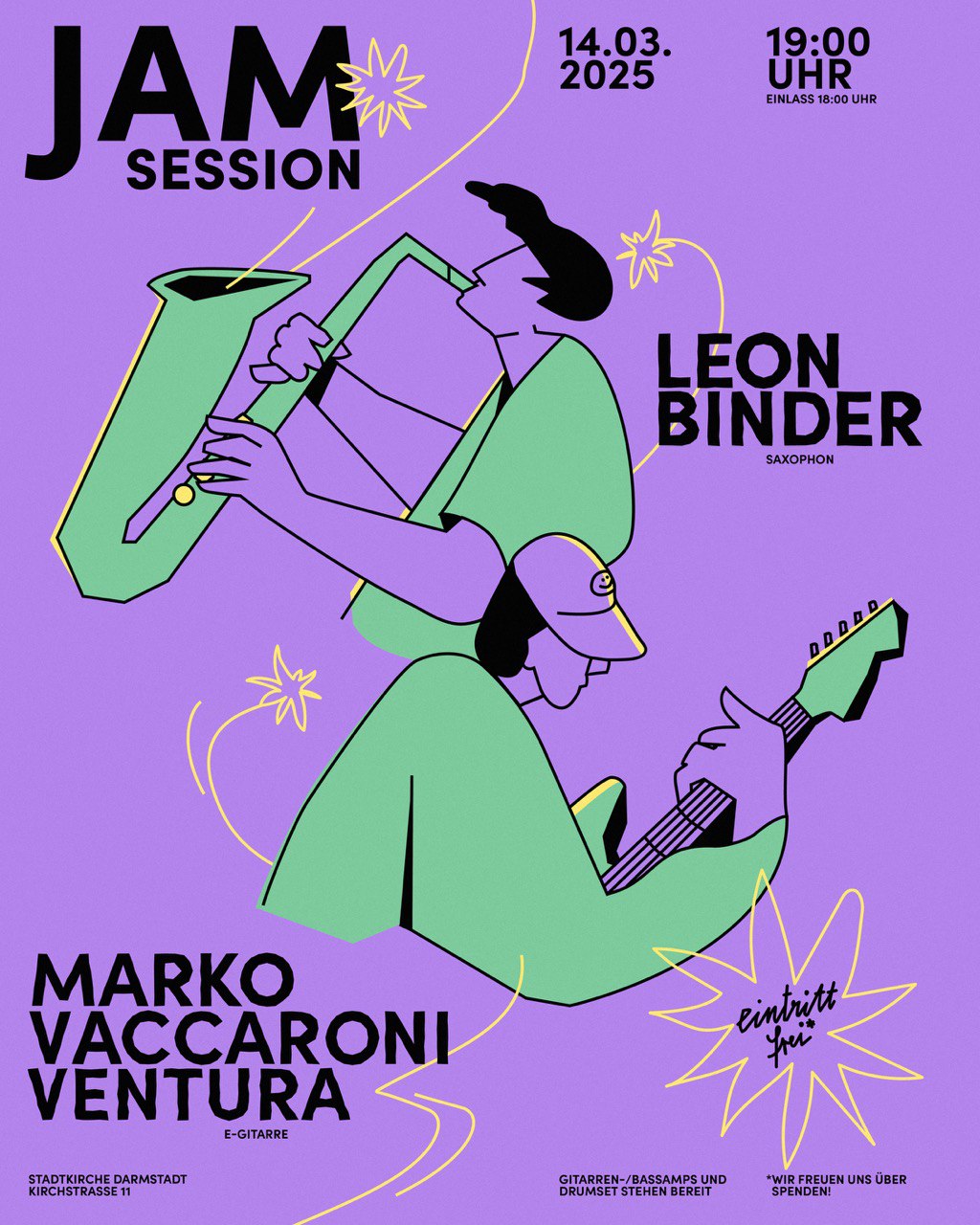 Immer wieder veranstaltet die Stadtkirche auf ihrer Bühne im Rahmen ihrer »Live!Jazz«-Konzertreihen Jam-Sessions von und für junge Musiker*innen aus der Region. Der Eintritt ist frei, für die Musiker*innen stehen Gitarrenamp, Bassamp, Drumset sowie eine PA für Gesang bereit.