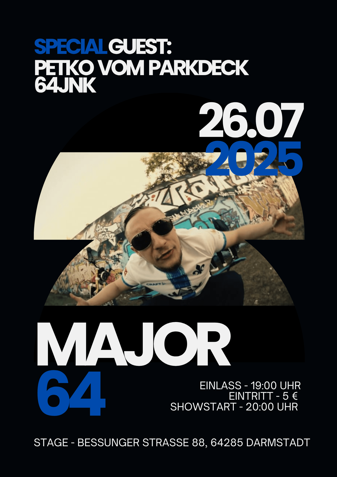 Major64s authentischer Straßenrap wird von petkovomp nostalgischem Sound vom Parkdeck sowie von einem der heißesten Newcomer, 64jnk, supportet.