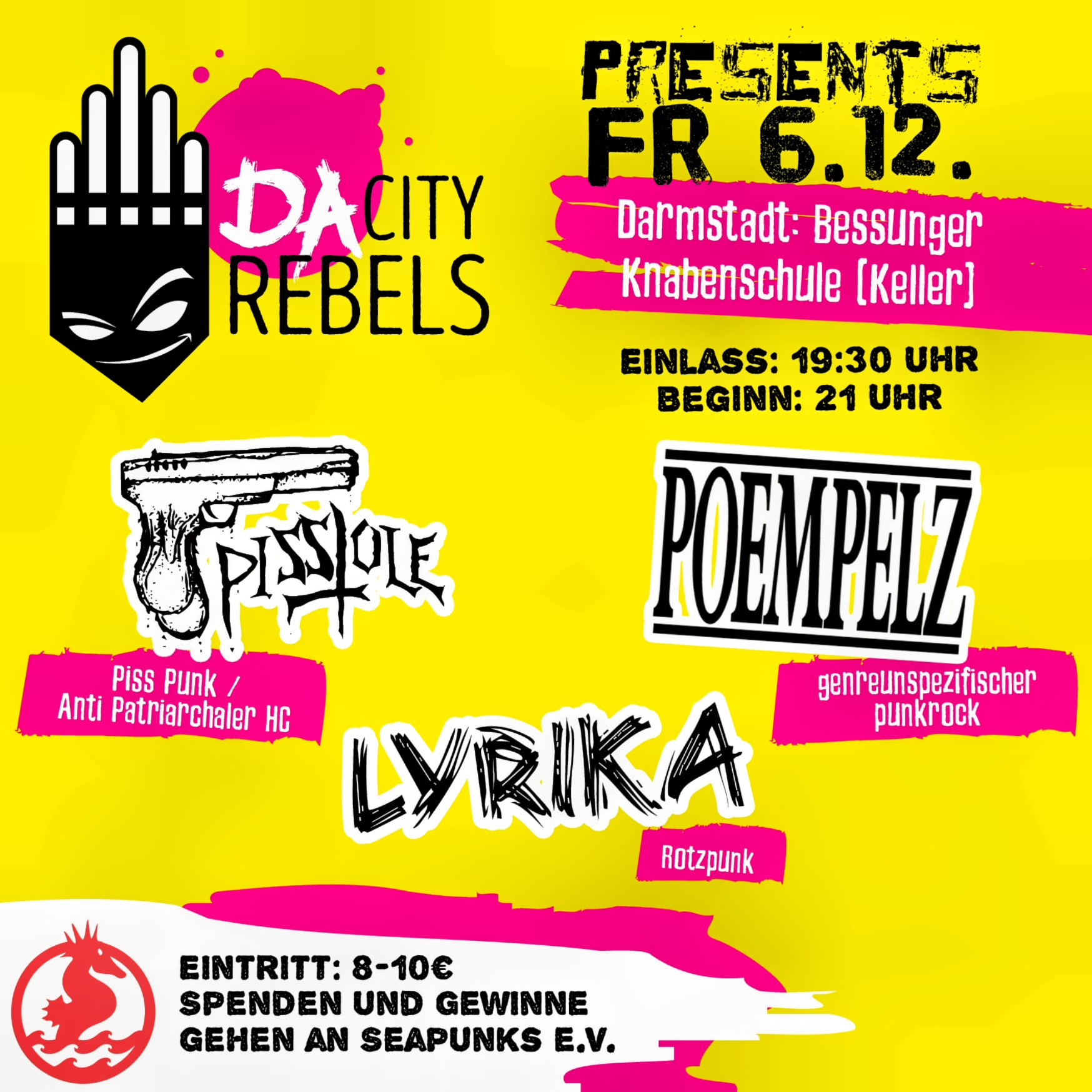 Die beliebte Benefizreihe der Darmstadt City Rebels geht in eine neue Runde. Diesmal wird's ein punkiger Abend mit Liveacts von Pisstole, Poempelz und Lyrica.