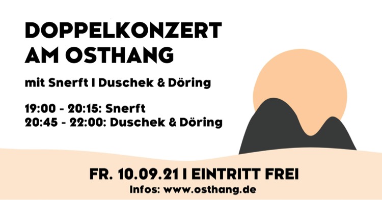 Mit Snerft und Duschek & Döring treffen gleich zwei Giganten des darmstädter Showgeschäfts an einem Abend auf der beschaulichen Bühne des Osthangs aufeinander. Ein Gipfeltreffen der Musikcomedy, ein akustischer Terroranschlag auf die Lachmuskeln!