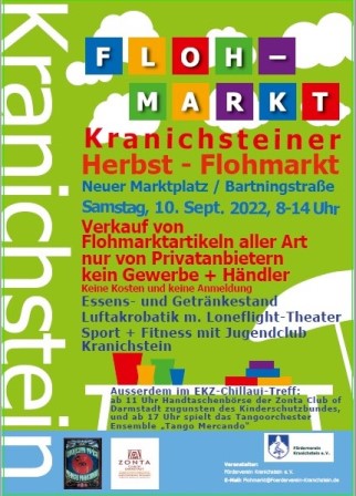 Wie bereits in den Vorjahren sind nicht nur Kranichsteiner, sondern alle Flohmarktinteressierte von nah und fern ganz herzlich eingeladen zu kaufen und zu verkaufen aber auch mit den KranichsteinerInnen fröhlich zu sein und zu feiern. Angeboten und gekauft werden kann alles, was auf einem Flohmarkt passt, allerdings nur von Privatleuten.