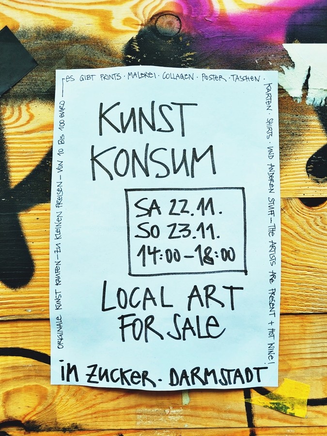 Originale Kunst von Darmstädter Künstler*innen kaufen, zu kleinen Preisen, von 10 bis 100 Euro. Was gibt es? Prints, Malerei, Collagen, Poster, Taschen, Karten, Shirts und anderen Stuff. Wie immer im Zucker: Drinks gegen Spende. Extra: Heißer Wein. The Artists are present.