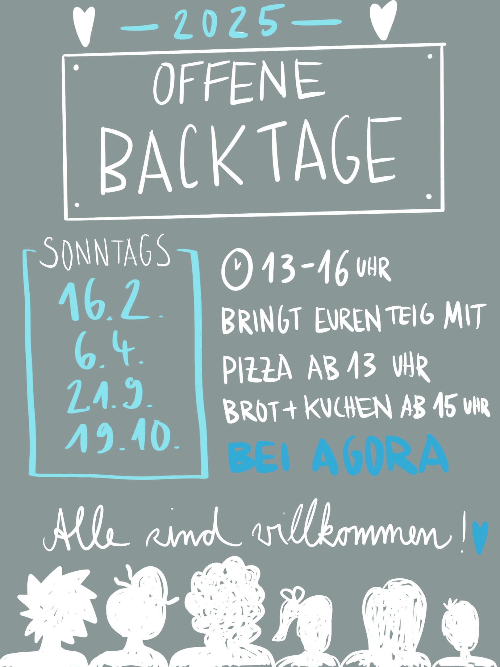 Bringt alle euren eigenen Teig mit, backt Pizza, Brot, Kuchen oder what ever. Erfahrene Back-AGORIS stehen euch mit Rat und Tat zur Seite.
