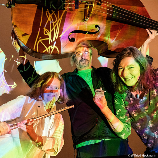 Was geschieht aber wenn ein Kontrabassist, eine Querflötistin, eine Zeichnerin und ein Schriftsteller aufeinandertreffen? Wie gestaltet sich ein Gespräch, wenn nur Töne, Klänge und Farben zur Verfügung stehen? Gibt es im Chaos der Genres eine Chance fürs Miteinander?