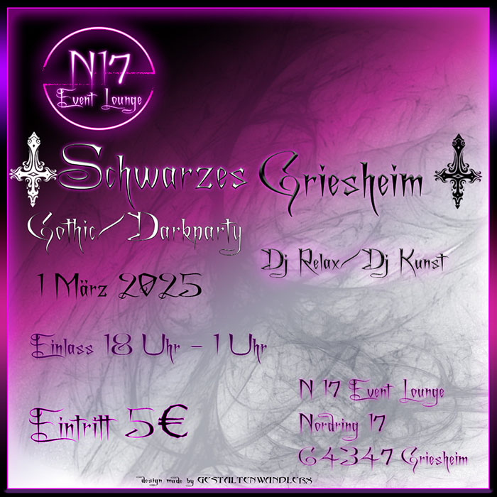 "Es wird "dunkel" in der N 17 Event Lounge. DJ Relax und DJ Kunst spielen die besten Goth und EBM Songs für Euch.