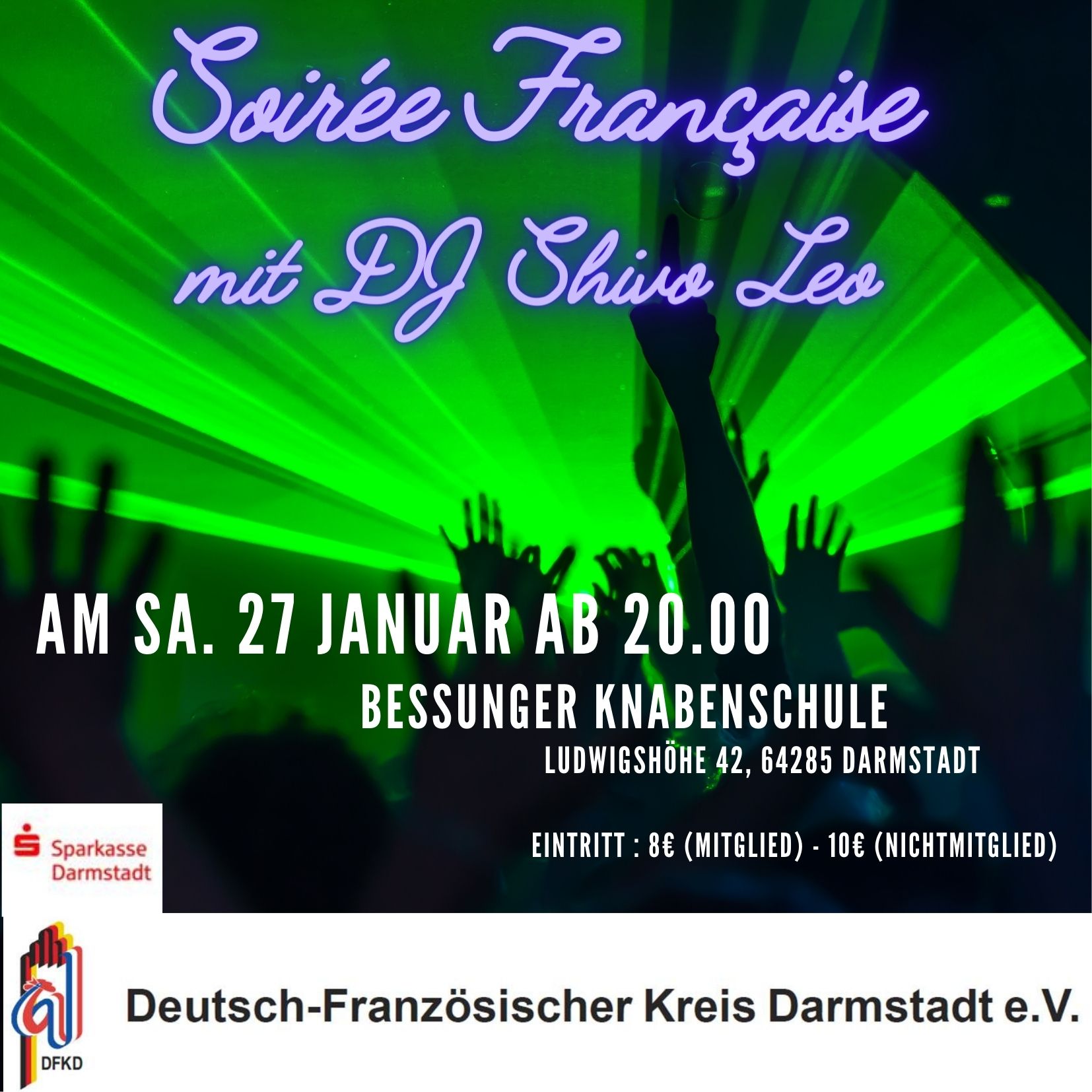 "Taucht ein in eine Nacht voller französischer Musik und rhythmischer Beats, präsentiert von DJ Shivo Leo. Am 27. Januar 2024 feiert der Deutsch-Französische Kreis Darmstadt e.V. den Jahrestag des Élyséevertrags mit einer mitreißenden Disco in der Bessunger Knabenschule. Die Tanzfläche erwartet Euch mit einer berauschenden Mischung aus zeitlosen Chansons und aktuellen Beats. Kommt das Tanzbein schwingen und die besondere Atmosphäre dieses Jubiläums genießen."