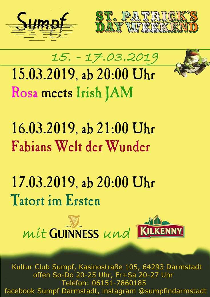 Dieses Wochenende ist St. Patrick's Day, und passend dazu feiert der Sumpf das "St. Paddys Weekend". Mit Guinness-Anstich und Kilkenny-Ausschank am Freitag (15.03.) zum Auftakt, dazu spielen Rosa aus Erfurt. Sowie Irish Jam, mit der Kern-Irish-Folk-Band Ceól agus ól.