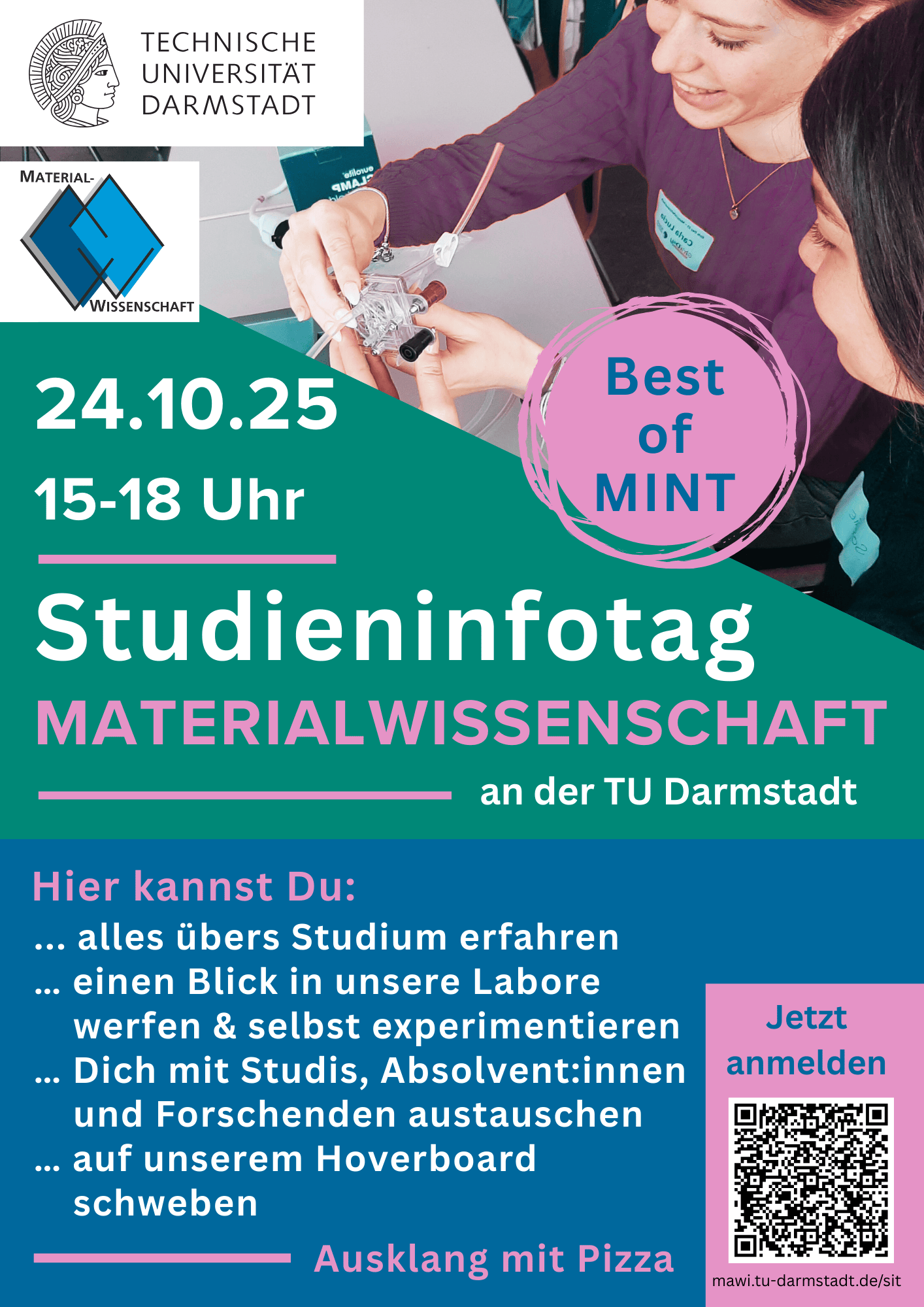 "Du willst irgendwas mit Naturwissenschaft oder Technik studieren? Dann ist dieses Event für dich! An unserem Studieninfotag wollen wir dir ein umfassendes Bild davon vermitteln, wie es ist, den "Best of MINT"-Studiengang Materialwissenschaft zu studieren und was man danach damit machen kann. Wir versorgen dich nicht nur mit trockenen Infos, sondern laden dich zum Schauen und Mitmachen in unser Institut ein, bringen dich in Kontakt mit Studierenden, Absolvent:innen und Forschenden. Keine Frage bleibt unbeantwortet. Natürlich darf auch ein Ride auf unserem waschechten Hoverboard nicht fehlen!