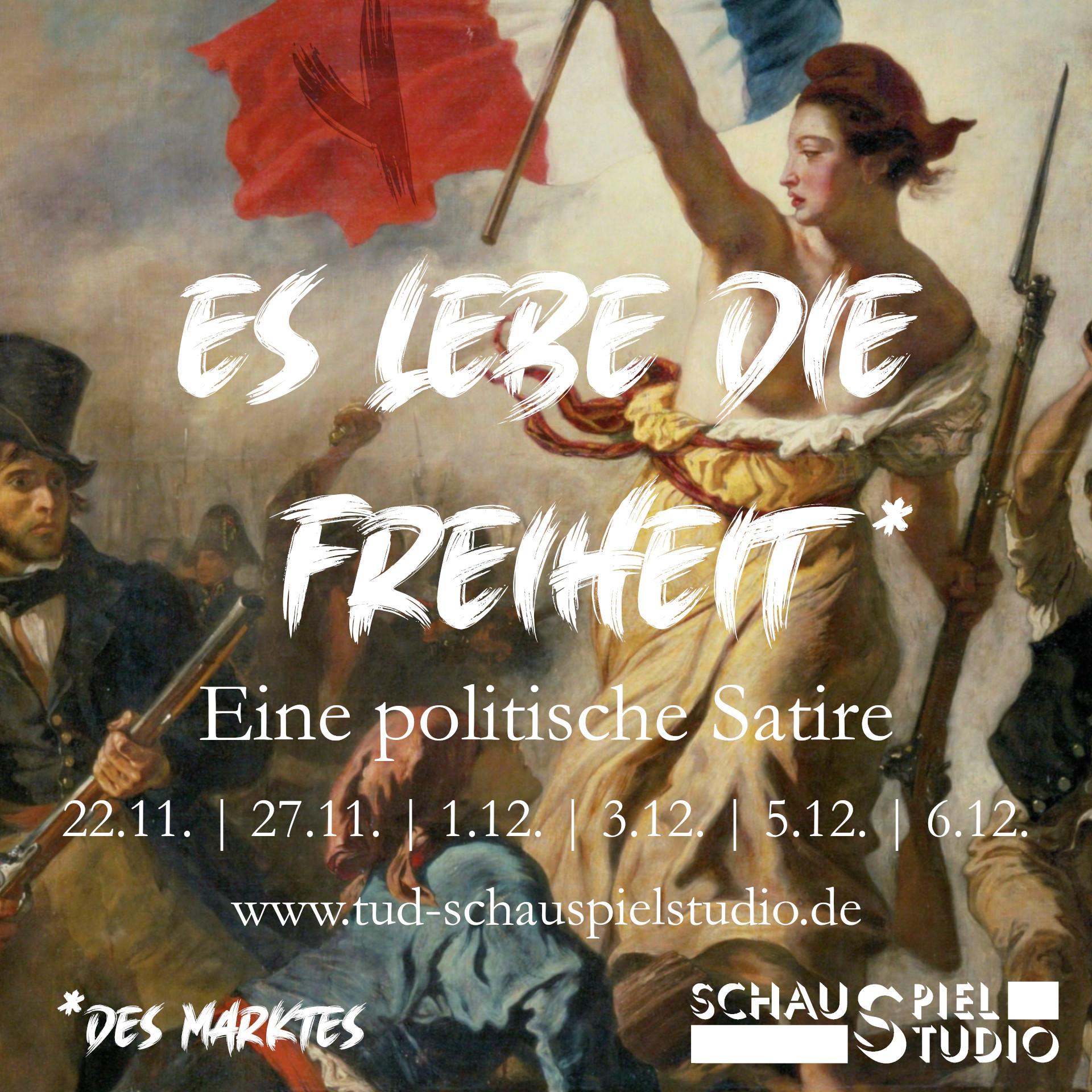 Es lebe die Freiheit!* ist eine bissige Satire, die mit absurder Komik, überdrehten Figuren und dystopischen Szenarien zeigt, wie dem Markt die unsichtbare Hand ausrutscht. Mit absurden Dialogen, surrealen Situationen und schwarzem Humor entführt das TU Darmstadt Schauspielstudio in eine Welt, in der die moralischen Hüllen fallen und absolut alles käuflich ist – sogar das Ende.