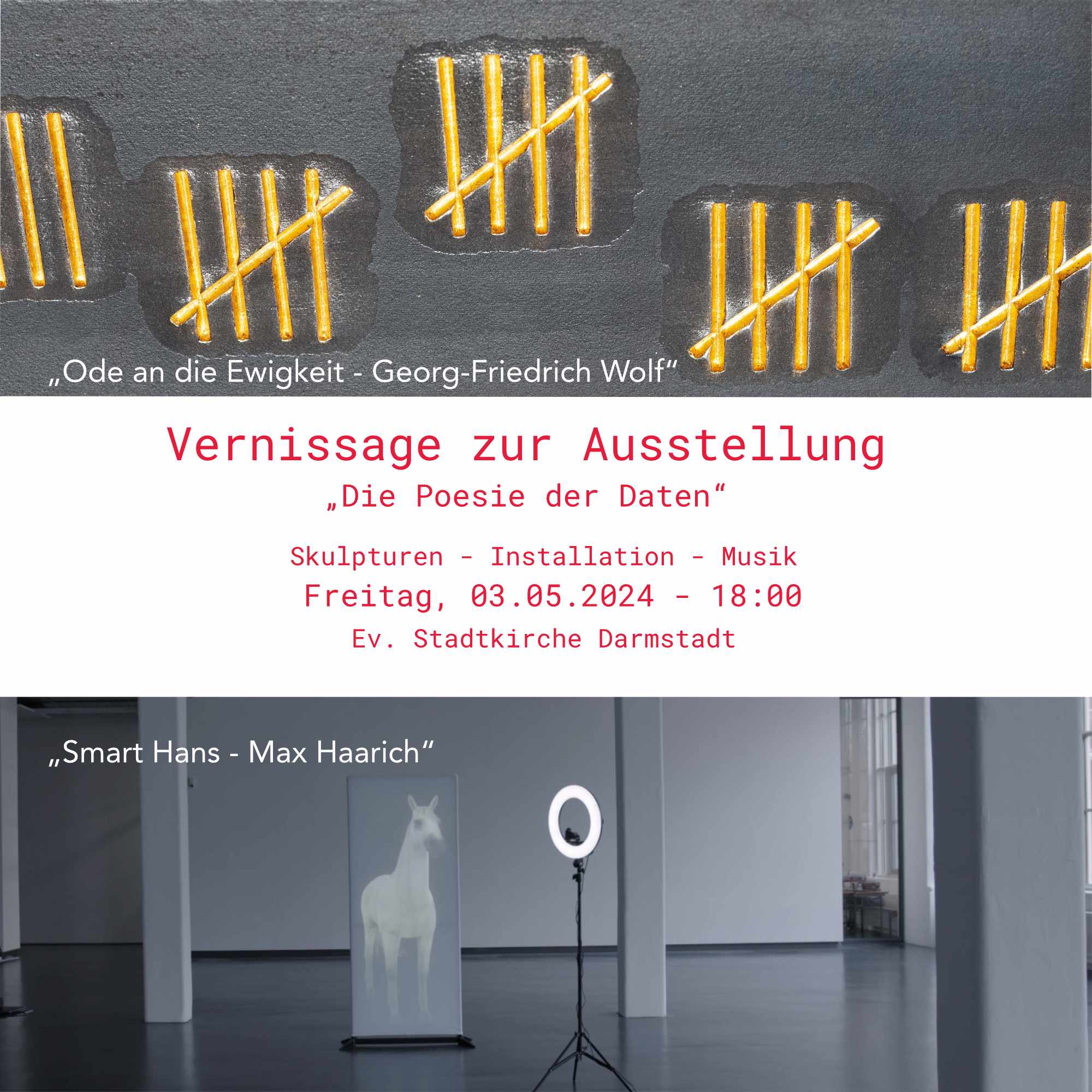 Mit zwei sehr unterschiedlichen Positionen eröffnen wir die zweite Kunstausstellung im Rahmen unserer Kunst-Veranstaltungsreihe „Die Poesie der Daten“ in der Ev. Stadtkirche Darmstadt. Hier die Datenzeichen, die schon seit 10.000 Jahren vom Menschen auf festen Materialien eingeritzt werden. Dort die digitale Medieninstallation, die mit künstlicher Intelligenz mit dem Zuschauer in Kommunikation tritt.