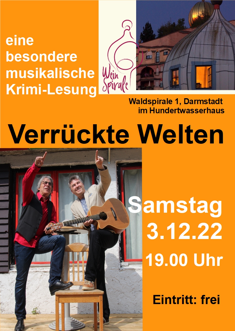 Ein Darmstädter Sozialarbeiter nutzt die dunkle Seite der menschlichen Kreativität, um daraus Geschichten zu entwickeln. Ein Walldorfer Rechtsanwalt und Liedermacher singt über das Gute im Menschen. Verrückte Welten treffen aufeinander, verweben sich und bereiten den Nährboden für einen tiefsinnig, amüsanten Abend. Abwechselnd werden Darmstädter Kurzkrimis und Textpassagen aus den „Dobermann-Romanen“ gelesen und der Liedermacher Harald Pons spielt Passendes dazu.