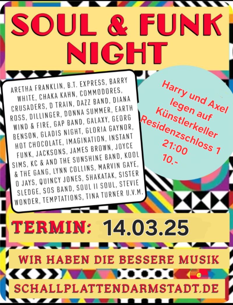 "Soul & Funk Night, mittlerweile DER Geheimtipp für Fans von Soul & Funk in der Darmstädter Szene. Wir freuen uns immer über viele Gäste die auch die weite Anreise aus FFM, Wiesbaden, Mainz, Aschaffenburg, Hanau nicht scheuen, das finden wir super, zusammen mit den vielen Heinern immer wieder ein top Abend."
