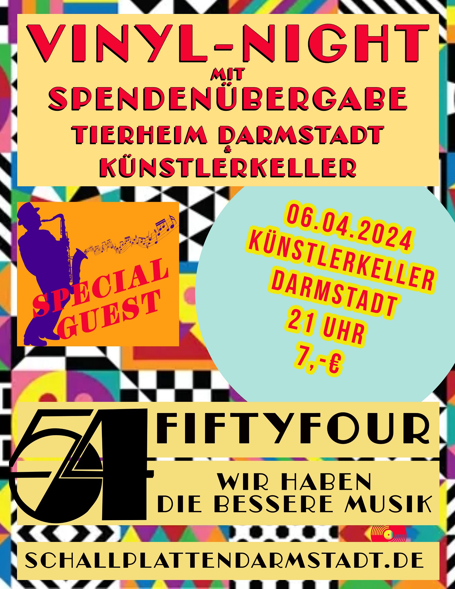 "Vinyl Night "54 wir haben die bessere Musik" eine weitere Spendenübergabeparty des Vinyl Flohmarkts von Harry Uhl, diesmal für den Künstlerkeller und das Tierheim Darmstadt. Es wird zu treibender, in die Beine gehende Musik getanzt in die sich immer mal unser Saxofonspieler einklinkt. Nicht die bei jeder ü30, 90er, 2000er üblichen hoch und runtergespielten Titel, wir kennen die besseren, besten, to Dance Diamanten."