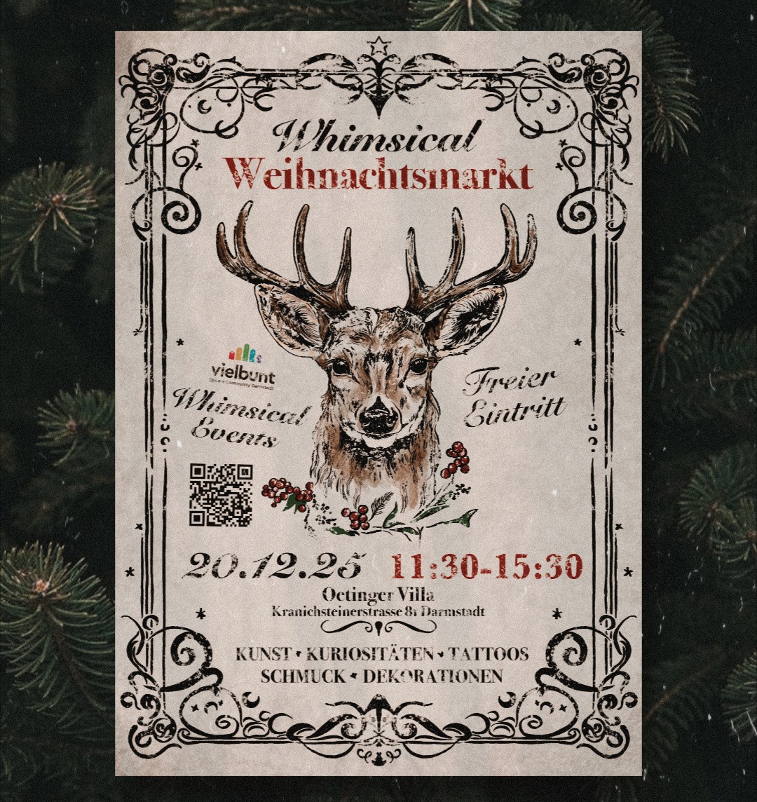 Ein magischer Fantasy Kunstmarkt zu Weihnachten mit handgemachtem Schmuck, Kuriositäten, Kunsthandwerk und Werken lokaler Künstlerinnen und Künstler. Dazu gibt es einen veganen Candy Stand, leckere Snacks und eine Tombola zugunsten des CSD. Gäste in Fantasy Verkleidung erhalten ein kleines Geschenk.